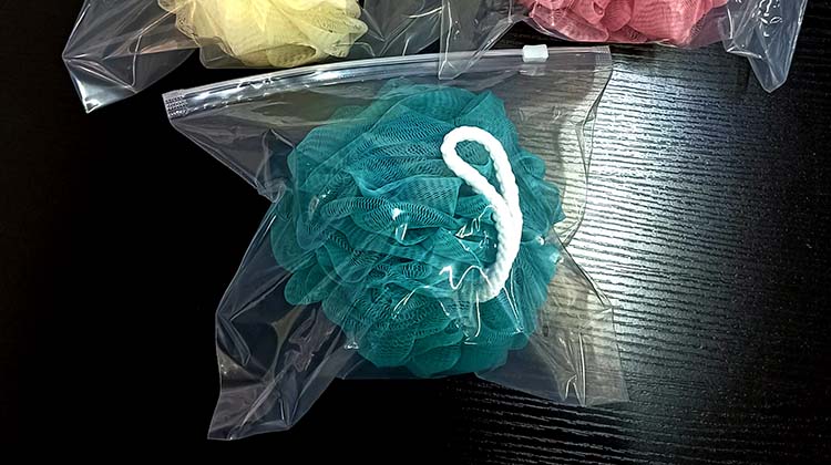 シャワーボールはご自宅で使う場合が多いですが、携帯も出来るように通常のOPP袋ではなくファスナー付きパッケージを御提案しました。